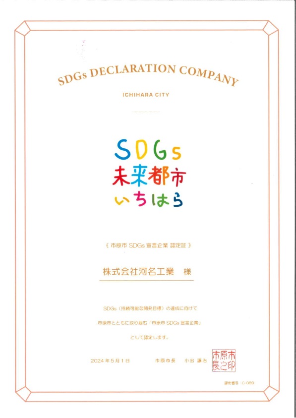 SDGs(持続可能な開発目標)は,国連サミットで採択された,2030年までに持続可能でよりよい世界を目指す国際目標です。地球上の「誰一人として取り残さない」ことを誓っています。SDGsは発展途上国のみならず,先進国自身が取り組むユニバーサル(普遍的)なものであり,日本としても積極的に取り組んでいます。2024年5月、株式会社河名工業は千葉県市原市よりSDGs宣言企業として正式に認定されました。持続可能な開発目標というテーマに向けて、河名工業ができることは何かをこれからも追い求め、取り組んでまいりたいと思います。