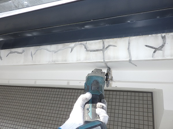 - Vカットシール工法 クラック幅1.0mm以上の比較的大きなひび割れに適した補修工法です。クラックに沿ってコンクリートを、幅約10mm・深さ10〜15mmでU字またはV字にカットし、ひび割れの中心を外さないように加工します。その後、シール材・ウレタン樹脂・低粘度エポキシ樹脂などの柔軟性に優れた補修材を充填し、密着性と追従性を確保します。大きなクラックにも確実性の高い補修が可能です。