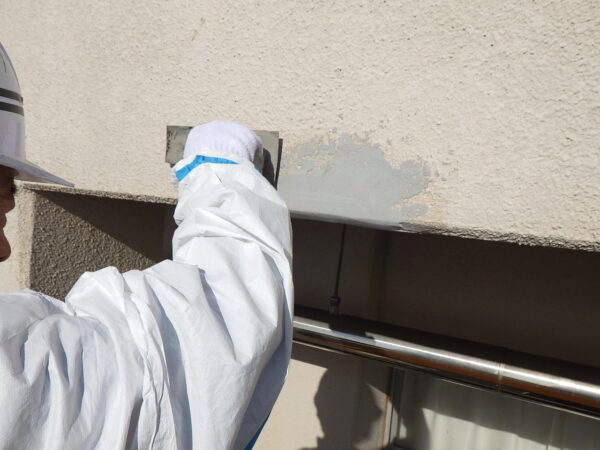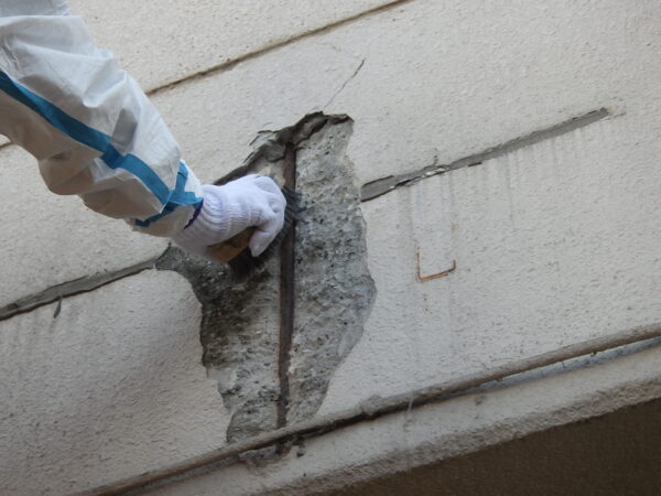 鉄筋コンクリート造の建物は、コンクリート内部の鉄筋によって強度を保っています。しかし、経年劣化によりひび割れから水分が入り込み、鉄筋が錆びて膨張すると、周囲のコンクリートが押し出され、剥がれ落ちる「爆裂(ばくれつ)」が起こることがあります。このまま放置すると、コンクリートの剥落、雨水の浸入による漏水、•構造耐力の低下といったリスクにつながります。爆裂欠損補修工法は、このようなリスクを防ぐために行う補修方法です。欠損した部分のコンクリートと鉄筋の錆を取り除き、防錆処理をした後にモルタル等で補修します。
